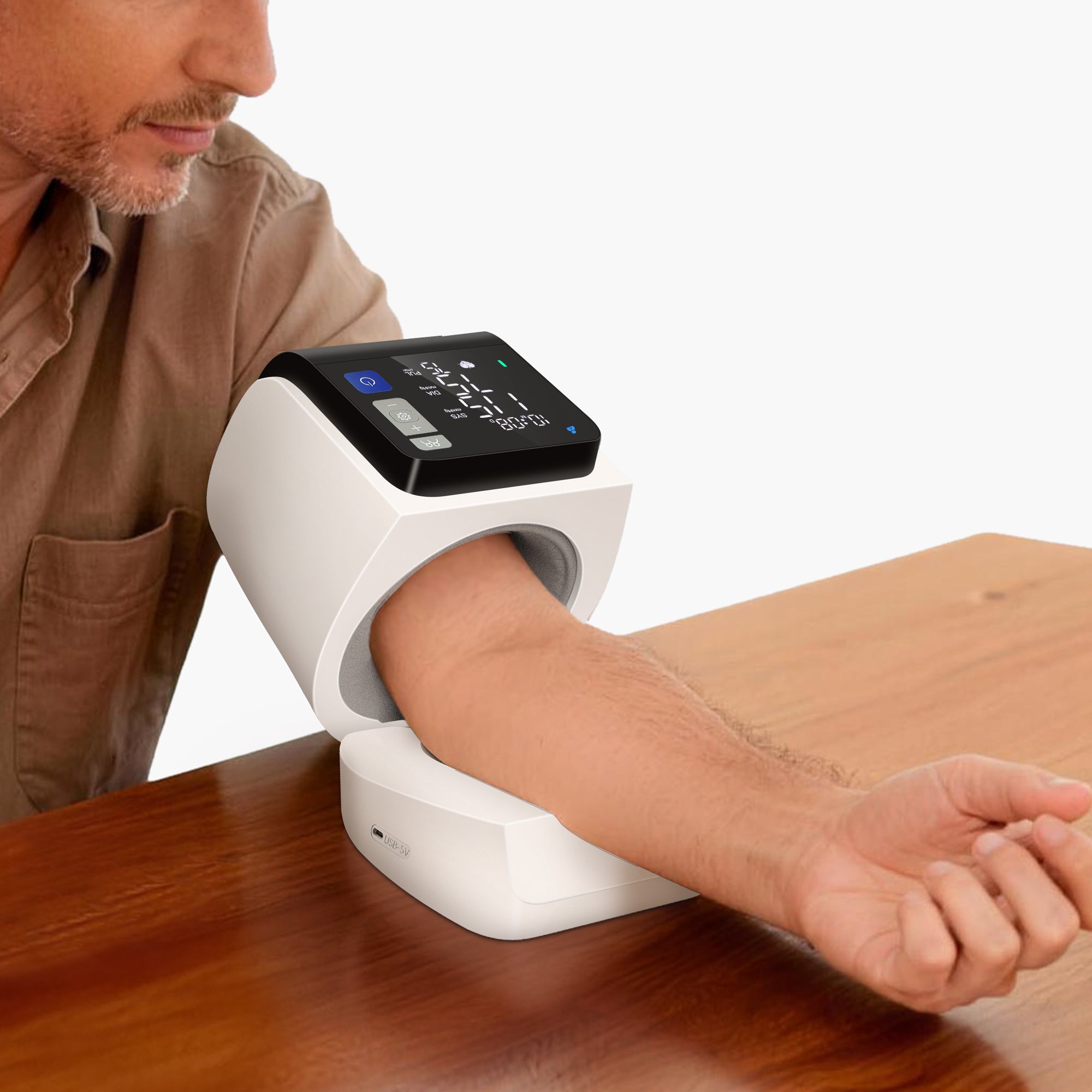 No need for traditional upper-arm cuffs. Simply insert your arm, and the system automatically adjusts inflation for precise and comfortable measurements.