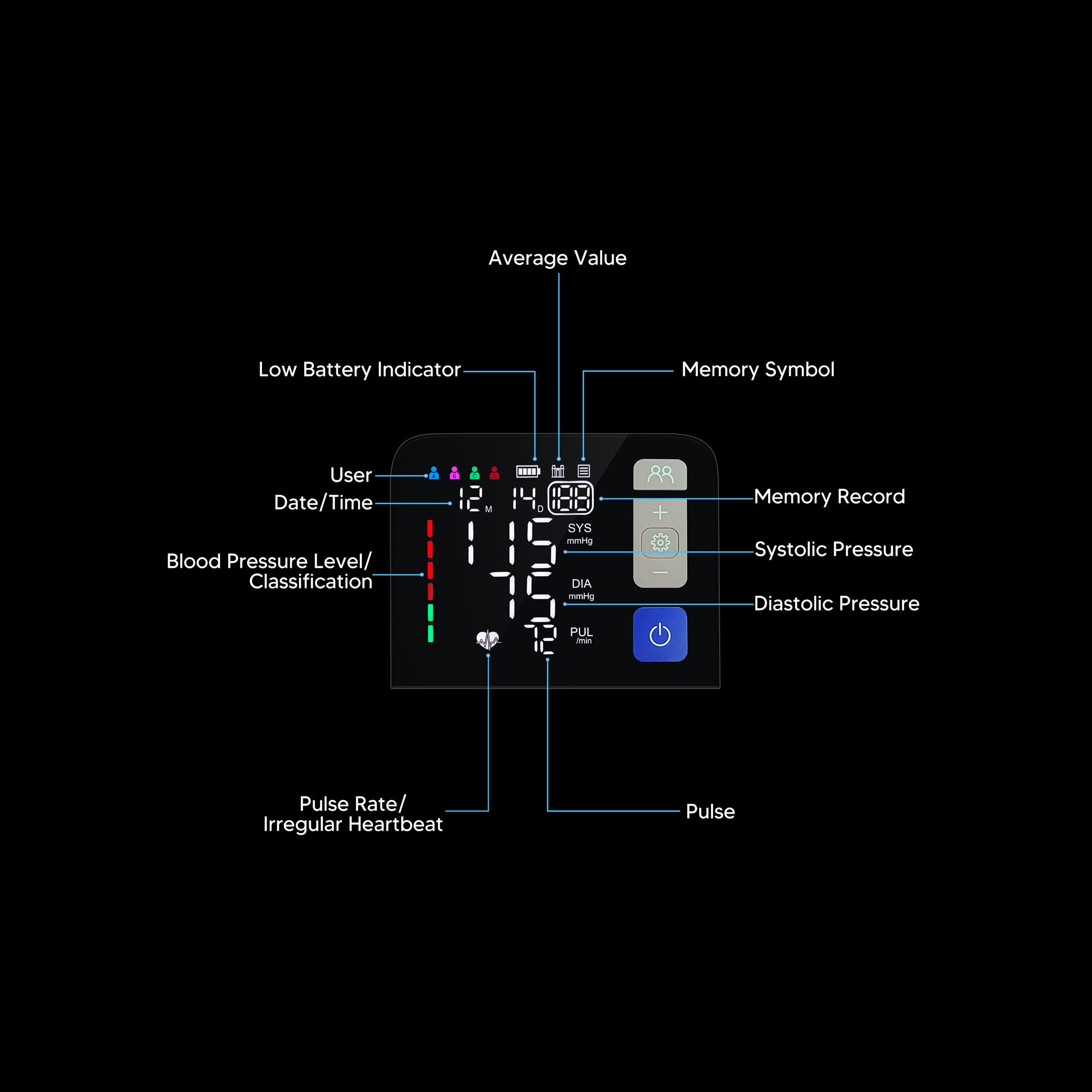 Easily monitor blood pressure for the whole family. Store over 199 readings per user with precise, reliable data.